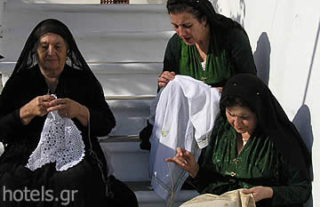 Donne sedute davanti casa con l’uncinetto in mano a preparare il corredo per le proprie figlie.