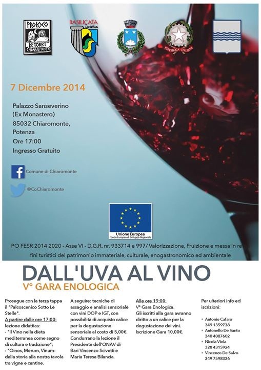 Oggi, 7 dicembre, “Palcoscenico sotto le stelle” riapre i battenti proprio con la gara enologica denominata “Dall’uva al vino” che si prefigge la promozione e valorizzazione del vino in tutte le sue possibili sfumature. La terza tappa avrà luogo nell’incantevole cornice offerta dal Palazzo baronale San Severino con start alle ore 17 che quest’anno ospiterà anche il mercatino di Natale allestito con prodotti artigianali realizzati in vari paesi del comprensorio uniti a prelibatezze chiaromontesi.