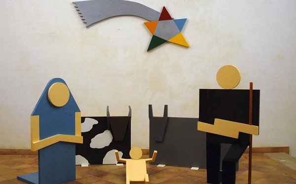 Trentasei formelle, tutte di cm 33×33, dispiegate sul tondo simile a una volta celeste rovesciata, con al centro, librate verso l’alto, le braccia aperte del Bambino, il volto estatico della Madonna e quello adorante di Giuseppe, apparecchiano doni, simboli, perle di saggezza, annunci, preghiere, inviti: Non temete, oggi nella città è nato il vostro Salvatore. Quattro cartigli come attributo degli evangelisti, tre uccellini che becchettano, quasi si apprestassero a saltare nelle mani del Bambino o dovessero essere tenuti per una funicella, una stella caduta dalla corona della Madonna per indicare la via verso Betlemme, una pagnotta che restituisce il corpo del pargoletto sprofondato nella culla e il sacrificio che verrà, tre uova ad annunciare il principio creativo e la rinascita, sette libri aperti e chiusi a personificare le virtù e le Sacre Scritture, due melegrane a trasmettere la rigenerazione della terra dopo il ritorno alla vita, un melone, una pigna, una verza ad esprimere la fertilità, vasi, orci, anfore e brocche per mirra, unguenti, olio santo, manna e vino, cinque pesci a rivelare che saremo chiamati al battesimo (le lettere della parola greca che significava “pesce” non costituivano le iniziali dell’espressione “Gesù/Cristo/di Dio/il Figlio/Salvatore”?), le rovine dei templi smantellati per costruire una Nuova Gerusalemme, la navicella che conserva l’incenso per le quotidiane preghiere da far salire al cielo e, accanto, due barrette d’oro, la conchiglia come distintivo dell’artista pellegrino che affronta il mare per sciogliere un dubbio (le cose non sono come sembrano) e da uomo di buona volontà trova la pace nella gloria di Dio. Pirozzi ha sintetizzato nel suo presepe secoli di iconografia e lunghe meditazioni, sottraendosi al brulicante coacervo del Presepe Cuciniello, cui ogni buon napoletano è costretto a fare riferimento, senza minimamente sacrificare, sul piano del linguaggio formale, i valori della rappresentazione. L’unico spettatore è lui, presente con la sua ombra ogni volta che ruota attorno al cerchio quasi dovesse offrire quanto ha modellato, anche i doni dei re Magi. Giuseppe Pirozzi è nato nel 1934 a Napoli, dove attualmente vive e lavora. Per informazioni e visite al presepe, contattare il numero 349 7576705 (Antonio Colaiacovo).