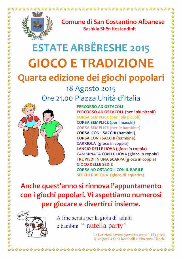 Per il quarto anno consecutivo, nell’ambito del programma delle manifestazione estive “Estate Arbëreshe”, si terrà a San Costantino Albanese l’atteso appuntamento con i “Giochi Popolari”. L’evento si svolgerà il 18 agosto alle ore 21,00 in Piazza Unità d’Italia. Sono sempre di più i bambini che ogni anno partecipano con entusiasmo e voglia di divertirsi, scoprendo i giochi del passato e dimenticando, almeno in tale occasione, TV e video game. I partecipanti della scorsa edizione sono stati circa 70 che, vestendo la maglietta appositamente creata per l’occasione, si cimentano nei vari giochi riempiendo la piazza di simpatia e allegria. A fine serata nutella party per tutti.Non ci resta che augurarvi buon divertimento.