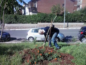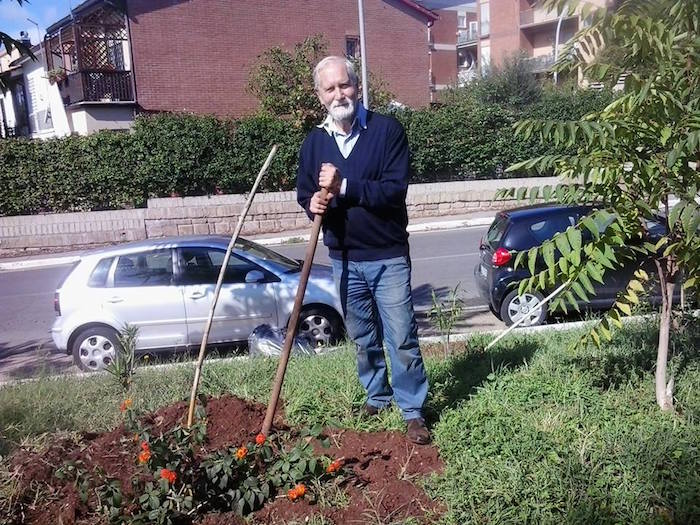 quotidianamente, aiutato con l’impegno volontario di due giovani, a regalare alla comunità un angolo urbano piacevole, strappandolo al degrado dilagante. L’iniziativa ha intrapreso il suo percorso di pari passo con i 30 oleandri, i 25 ligustri, i 15 lecci, 7 ibiscus, 12 Yucca, un noce, un nespolo, un cipressetto, una poppe d’angelo, due mirto, due plumbaco, tre lantana, un corbezzolo, una aralia, una abelia, un limone, due mimose e una decina di piante in fioritura. I fiori sono veramente degni dell’importanza che viene loro attribuita, perché oltre a fornire in ogni stagione un arcobaleno di colori, spesso emanano aromi gradevolissimi. Inoltre, Adriano coltiva un piccolo orto con la messa a dimora di 10 cavolfiori, 70 piantine di insalata e una varietà di ortaggi da donare agli immigrati ospitati nella Parrocchia del quartiere che ha raccolto l’invito di Papa Francesco. Siamo di fronte a un bellissimo esempio che, indubbiamente non rappresenta un caso isolato rispetto ai 150 orti e giardini condivisi che si contano nella città di Roma. Favorire la progettazione del territorio urbano, incentivando la