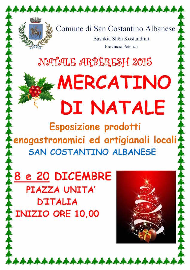 Si terrà a San Costantino Albanese, nei giorni 8 e 20 dicembre 2015, “Il Mercatino di Natale” dove verranno esposti i prodotti tipici locali della gastronomia e dell’artigianato. La manifestazione si terrà in Piazza Unità D’Italia con inizio dalle ore 10,00. Sarà l’occasione per far conoscere e promuovere i prodotti agroalimentari locali quali, il miele, i salumi, la pasta fresca, i prodotti da forno, i prodotti agricoli tradizionali nonché gli oggetti di artigianato. Negli ultimi tempi sono cresciute le aziende che producono e commercializzano i prodotti tradizionali, alcuni anche certificati dal Ministero delle Risorse Agricole, che attirano sempre più l’attenzione dei mercati non solo locali. L’Amministrazione Comunale con questa iniziativa intende promuovere le aziende locali con l’obiettivo di far crescere le realtà economiche esistenti anche con l’obiettivo di creare sempre nuove iniziative nel campo delle produzioni tipiche. Il 2015 è stato una anno che ha visto la presenza a San Costantino Albanese di numerosi turisti, attratti dalla