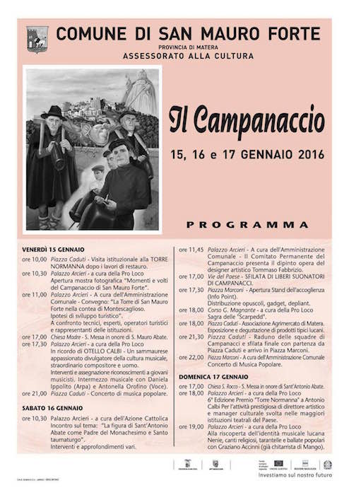 L’Epifania tutte le feste porta via? Niente di più sbagliato per San Mauro Forte, piccolo centro della Collina Materana che in questi giorni, con ansia, attende la tradizionale festa del Campanaccio (15-17 Gennaio) in onore di Sant’Antonio Abate. E’ in questa occasione (e purtroppo con rammarico bisogna dire solo in questa) che il paese vive una tre giorni davvero inusuale di festeggiamenti a suon di campane, piccole o grandi, che vengono agitate in segno di devozione, tradizione e scaramanzia.