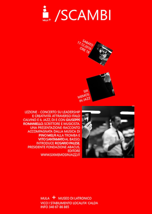 Sabato 17 dicembre 2016, alle ore 18.00, il MULA+ di Latronico (PZ) ospiterà l’evento Six Memos in Jazz, una lezione- concerto su leadership e creatività attraverso Italo Calvino e il Jazz. La performance vedrà protagonista Giuseppe Romaniello, scrittore e musicista, che farà una presentazione racconto accompagnata dalla musica di Pino Melfi, alla tromba e Vito Santamato al basso. Il concerto sarà introdotto da Rosario Palese, presidente della Fondazione Abacus.