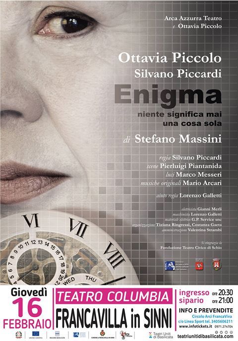 Dal 16 al 18 febbraio, l’attrice Ottavia Piccolo porta in scena sui palcoscenici lucani lo spettacolo “Enigma. Niente significa mai una cosa sola”, un’indagine sull’ambiguità della storia, proposto dalla Stagione Teatrale 2016-2017 del consorzio Teatri Uniti di Basilicata: giovedì 16 febbraio, alle ore 21, al Teatro Columbia di Francavilla, venerdì 17, ore 21, al Teatro Obadiah di Oppido Lucano e sabato 18, ore 21, al Teatro Lovaglio di Venosa.