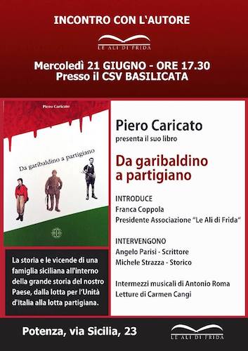 di Frida: presentazione del romanzo storico di Piero Caricato “Da garibaldino a partigiano” mercoledì 21 giugno presso il CSV Basilicata in Via Sicilia 23 a Potenza.