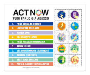In alto, a sinistra, è riprodotto il logo di “ACT NOW” seguito dalla leggenda “PUOI FARLO GIÀ ADESSO” e dall’elenco delle dieci azioni finalizzate al raggiungimento della sostenibilità ambientale: