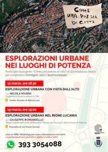 Nell’ambito del progetto “Come una poesia di città”, promosso da Gommalacca Teatro e sostenuto dal Comune di Potenza, sabato 12 marzo alle ore 16.30, presso il centro sociale di Malvaccaro, è in programma una esplorazione urbana con visione aerea dedicata alla forma della città di Potenza, con la guida di Nicola Masini, dirigente di ricerca del CNR. Una seconda esplorazione urbana è prevista per sabato 19 marzo alle ore 15, all’interno del quartiere rione Lucania di Potenza, con partenza dalla piazzetta di via Orazio Gavioli. Ad accompagnare i partecipanti, seguendo le strade che portano i nomi di alcuni importanti personaggi lucani, ci sarà come guida d’eccezione Giuseppe Romaniello, responsabile dell’unità di direzione “Servizi alla persona” del Comune di Potenza, oltre che attento conoscitore della città e delle sue storie. Per partecipare agli appuntamenti, entrambi gratuiti, è possibile prenotarsi inviando un sms o un messaggio WhatsApp al numero 393/3054088.