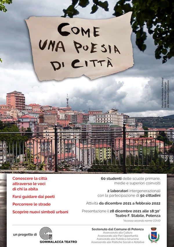 Guardare la città di Potenza con gli occhi della poesia per costruire una nuova storia mettendo insieme racconti, ricordi e pezzi di esistenze. È quello che si propone di fare “Come una poesia di città”, progetto di Gommalacca Teatro sostenuto dagli Assessorati alle Politiche Sociali e Abitative, alla Cultura, alla Pubblica Istruzione e alle Pari Opportunità del Comune di Potenza. L’iniziativa nasce dall’esigenza di sensibilizzare le nuove generazioni di cittadini potentini ai tratti distintivi – storici, urbanistici, di tradizione – della città, per rafforzare il senso di appartenenza e dargli un nuovo significato nel contesto sociale contemporaneo. Obiettivo finale creare la prima mappa visiva e sonora della città di Potenza.