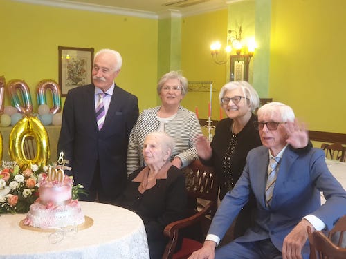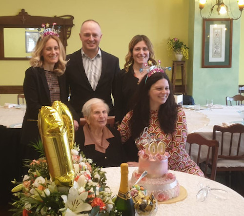 Circondata dall’affetto delle figlie Flora e Ninetta dei rispettivi mariti Gino Coghetto e Leone (Nino) Pezzi e dei nipoti Alessandro, Isabella, Elisabetta e Luisa nonché da numerosi parenti e amici, la Zia Nicolina De Fino – vedova Febbraio, ha festeggiato il bellissimo traguardo dei cento anni.