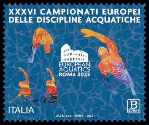 Bozzetto a cura di Elevan S.r.l. e della Società per l’Organizzazione dei Campionati Europei di Nuoto 2022 e ottimizzato dal Centro Filatelico della Direzione Operativa dell’Istituto Poligrafico e Zecca dello Stato S.p.A.