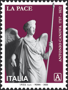 Completano il francobollo le legende “ANTONIO CANOVA 1757 – 1822”, “LA PACE”, la scritta “ITALIA” e l’indicazione tariffaria “A”.