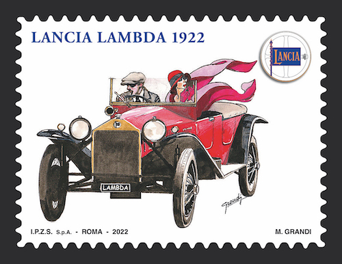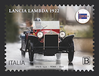 Poste Italiane comunica che oggi 22 ottobre 2022 viene emesso dal Ministero dello Sviluppo Economico un francobollo ordinario appartenente alla serie tematica “le Eccellenze del sistema produttivo ed economico” dedicato alla Lancia Lambda, nel centenario della commercializzazione, relativo al valore della tariffa B pari a 1,20€.