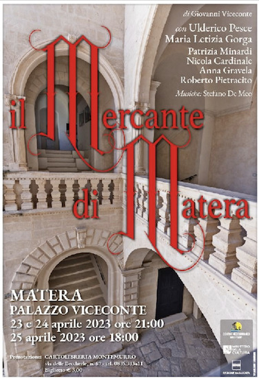 A Matera, nei giorni 23, 24 e 25 aprile prossimi, Ulderico Pesce e la sua compagnia porteranno in scena “Il mercante di Matera” una riduzione teatrale dello stesso Ulderico Pesce tratta dal romanzo storico di Giovanni Viceconte per la Rubettino Editore.