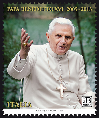 Poste Italiane comunica che oggi 16 maggio 2023 viene emesso dal Ministero delle Imprese e del Made in Italy un francobollo commemorativo di Papa Benedetto XVI, relativo al valore della tariffa B zona 1-50g pari a 3,05€.