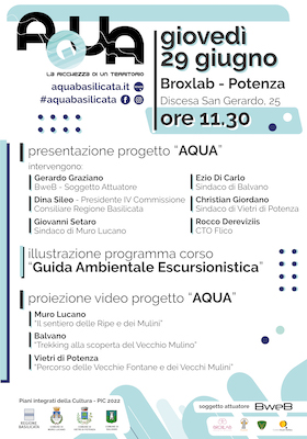 POTENZA – Arriva anche a Potenza il progetto PIC “Acqua- la ricchezza di un territorio”. Giovedì 29 giugno, alle ore 11:30, negli spazi di Broxlab (Discesa San Gerardo, 25) saranno presentati il progetto e il programma del corso di Guida Ambientale Escursionistica.
