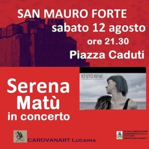 Da ricordare, inoltre, il concerto in programma il 12 agosto a San Mauro Forte, della cantautrice Serena Matù. Il suo primo incontro con il pubblico lucano è avvenuto nella sala consiliare di Vietri di Potenza all’inaugurazione di una delle prime tappe della mostra itinerante Carovanart Lucania allestita nel Palazzo comunale. Ha seguito Carovanart in diverse tappe presentando il suo primo disco all’inaugurazione della mostra di Grassano. Decide, poi, di proseguire gli studi di musica e canto con maestri affermati e dopo il successo del secondo disco presenta a San Mauro Forte il terzo disco “Io sto bene”.