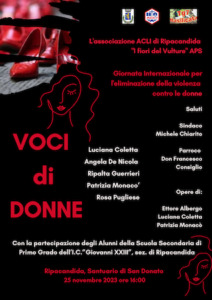 In occasione della ventiquattresima Giornata internazionale per l’eliminazione della violenza sulle donne, sabato 25 novembre 2023, presso il piazzale del Santuario San Donato a Ripacandida (Potenza), l’Amministrazione Comunale, in collaborazione con l’Associazione locale Acli “I fiori del Vulture”, con l’Istituto Comprensivo “Giovanni XXIII” Sez. Ripacandida ed il complesso monastico Santuario San Donato, promuovono un raduno poetico-artistico intitolato “Voci di Donne – Fa che io sia l’ultima”.