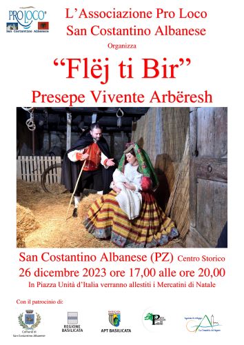 L’Associazione Pro Loco San Costantino Albanese, con il patrocinio del Comune di San Costantino Albanese, del GAL La Cittadella del Sapere, dell’APT Basilicata, della Regione Basilicata e del Parco Nazionale del Pollino, presenta “Flëj ti Bir”, il Presepe Vivente Arbëresh.
