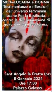 “Medinlucania è donna. Testimonianze e riflessioni dell’universo femminile lucano. Per la Basilicata, contro la discriminazione di genere in ogni sua forma”, questo il tema del convegno che si svolgerà venerdì prossimo 5 gennaio alle ore 17:00 a Sant’Angelo le Fratte (Palazzo Galasso).