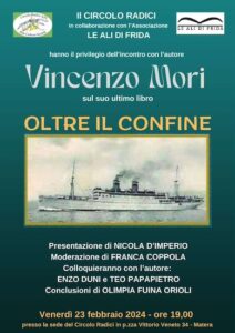 Il circolo “Radici” di Matera, in collaborazione con l’Associazione “Le Ali di Frida” di Potenza, venerdì 23 febbraio, alle ore 19, presso la sede del Circolo Radici, in piazza Vittorio Veneto 34, ha l’onore di colloquiare con Vincenzo Mori autore del libro “Oltre il Confine” edito da Osanna Edizioni, Venosa (Potenza).