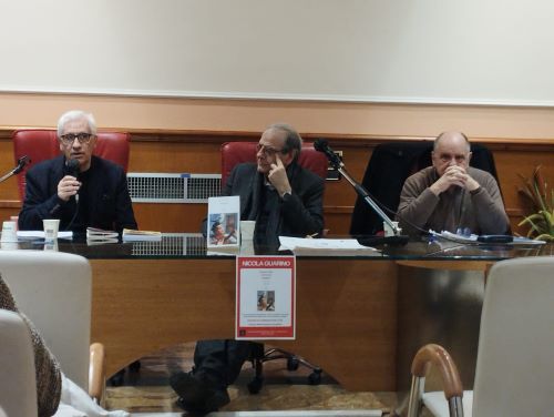 Lo enuncia lo stesso Guarino. Alla presentazione del libro al Circolo della Stampa di Avellino (cui le immagini), il filosofo Fausto Baldassarre, in una dotta analisi dei racconti non ha mancato di rimarcare i riferimenti ai maestri del pensiero, come Hegel e la fenomenologia dello spirito evocato nel titolo del libro Tutto qui. Ha quindi sottolineato l’importanza per Nicola Guarino di guardare a ritroso il mondo della sua giovinezza e della napoletanità in una ottica di maggiore spessore, grazie alla sua pluridecennale esperienza parigina ed universitaria. In tre parole chiave: il sentimento, l’immagine e la parola. Al Nicola Guarino in dono il manifesto del CineClub Vittorio De Sica di Rionero e l’ultimo numero di Cabiria edito da Cinit.