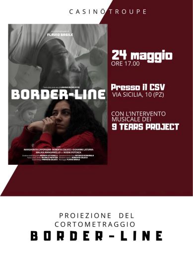 Venerdì 24 Maggio dalle ore 17, presso il CSV Basilicata (Via Sicilia 10) si svolgerà la presentazione del cortometraggio “Border-line”, ultimo cortometraggio della Casinö Troupe, gruppo cinematografico giovanile della Basilicata.