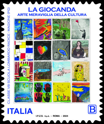 Completano il francobollo le legende “LA GIOCANDA”, “ARTE MERAVIGLIA DELLA CULTURA” e “CLASSE VB SCUOLA LOMBARDO RADICE – MAGIONE (PG)”, la scritta “ITALIA” e l’indicazione tariffaria “B”.