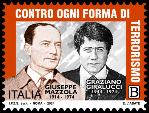 Poste Italiane comunica che oggi 25 maggio 2024, viene emesso dal Ministero delle Imprese e del Made in Italy un francobollo ordinario appartenente alla serie tematica “il Senso civico” contro ogni forma di terrorismo: Giuseppe Mazzola e Graziano Giralucci, relativo al valore della tariffa B pari a 1,25€.