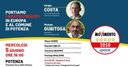 Ai due eventi interverranno i candidati del M5S alle elezioni europee Vincenzo Incampo della Basilicata, Maura Sarno e Maurizio Sibilio e per le comunali di Potenza il candidato sindaco Pierluigi Smaldone e i candidati del M5S.