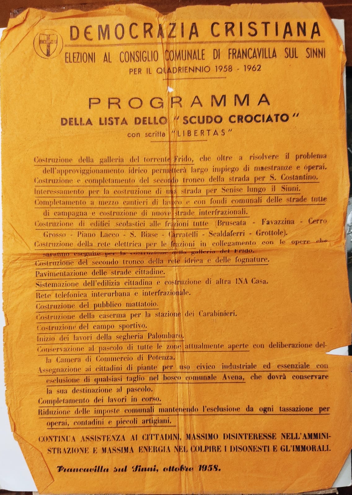 Le vicende storiche e politiche della Democrazia Cristiana a Francavilla in Sinni consentono di affermare che nel lungo periodo intercorrente tra il 1946 ed il 1992, data del suo scioglimento, la Democrazia Cristiana ha rappresentato un ineludibile riferimento per l’elettorato ed ha consumato, sia pure con un ventennio di alternanza con la sinistra, una meravigliosa vicenda, che ha dato significativo impulso alla crescita sociale, economica e culturale della comunità, facendone un punto di centralità politica non solo nella Valle del Sinni, ma dell’intero lagonegrese.