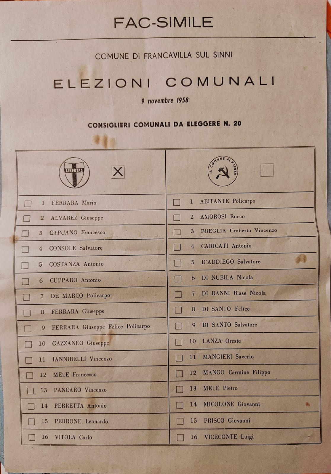 Nelle elezioni amministrative del 1952, si presentarono due liste, la n. 1 con l’effige di Garibaldi in stella costituita da PCI e PSI e la n. 2 costituita dalla Democrazia Cristiana e dal Sole nascente.
