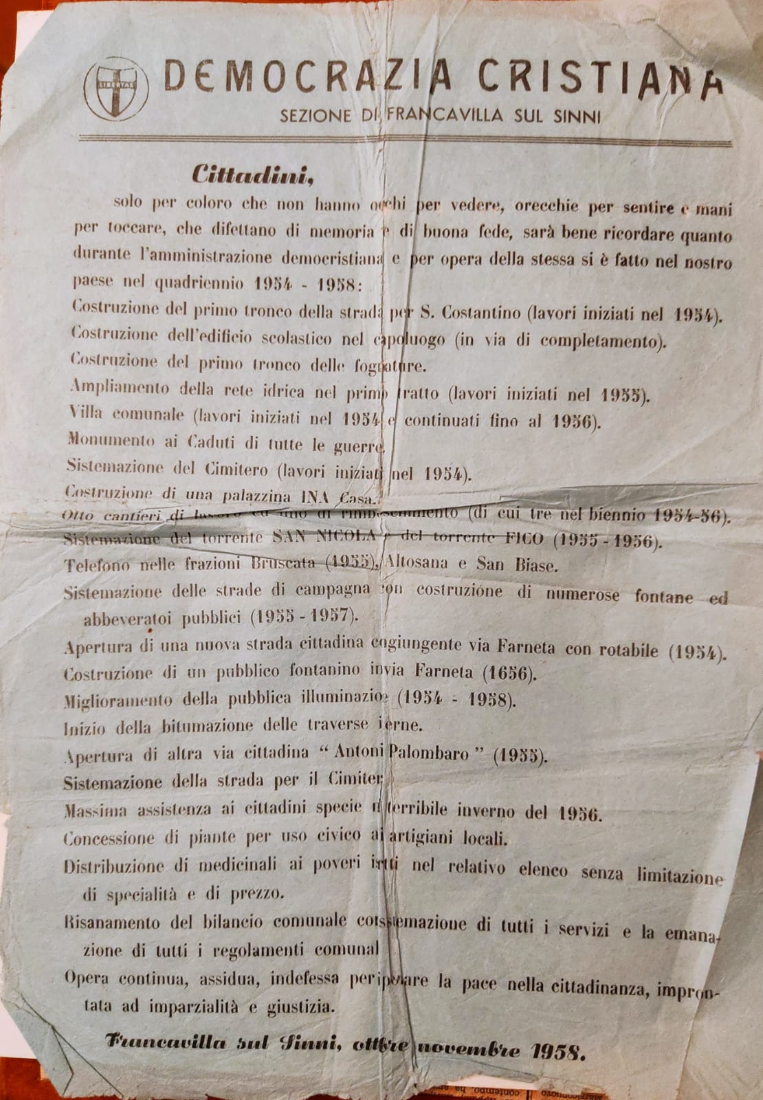 Con le elezioni amministrative del 27.6.1954, la Democrazia Cristiana, con una lista capeggiata dall’Avv. Mario Ferrara, travolse la lista di sx capeggiata dall’ins. Giuseppe Pangaro.