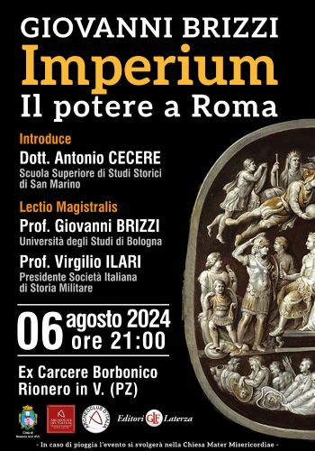 Si svolgerà a Rionero, nella serata di Martedì 6 Agosto alle ore 21:00 presso la suggestiva location dell’Ex Carcere Borbonico-Museo del Brigantaggio sito nell’antico Rione Annunziata della cittadina fortunatiana, la presentazione del volume storico dal titolo “Imperium – Il potere a Roma” scritto dal Prof. Giovanni Brizzi a cui seguirà poi una Lectio Magistralis sulla tematica in questione a cura dello stesso Prof. Giovanni Brizzi e del Prof. Virgilio Ilari. L’evento è brillantemente promosso ed organizzato dall’Archeoclub del Vulture Aps “Giuseppe Catenacci” di Rionero in Vulture, Edizioni Laterza Roma-Bari e con il patrocinio del Comune di Rionero.
