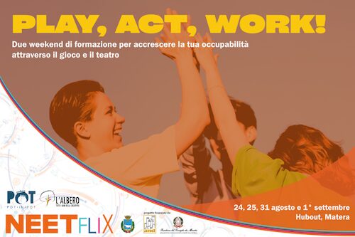 MATERA – Sono aperte le iscrizioni a “Play, Act, Work!”, laboratorio formativo progettato da Pot in Pot e dalla Compagnia teatrale L’Albero per ragazzi e ragazze dai 16 ai 35 anni interessati a potenziare le proprie competenze trasversali e personali attraverso metodi non convenzionali e creativi. Il laboratorio è articolato in due moduli distinti, che si svolgeranno nei weekend del 24-25 agosto e del 31 agosto-1 settembre a Matera, presso lo spazio Hubout.