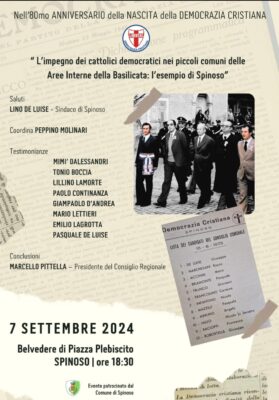 Tra le manifestazioni per celebrare gli 80nni dalla nascita della Democrazia Cristiana, il 7 SETTEMBRE 2024 alle 18.30, in occasione del 39mo anniversario della scomparsa all’età di 44 anni di Giuseppe De Luise, Sindaco democristiano di Spinoso per 3 legislature e Presidente della Comunità Montana Alto Agri dal 1981 al 1985 e a 32 anni dalla scomparsa del fratello Michele (a soli 54 anni) storico segretario della Dc di Spinoso dal 1974 al 1990 e Sindaco dal 1990 al 1992, ci si incontra a Spinoso, nella splendida cornice del tramonto dal belvedere di Piazza Plebiscito, in una riflessione comune sul tema “L’impegno dei cattolici democratici nei Piccoli Comuni delle aree Interne della Basilicata: l’esempio di Spinoso”.