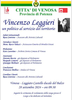 La cerimonia ufficiale si è tenuta alla presenza del Prefetto Michele Campanaro e delle massime autorità Militari, presso il Largo della Rotonda, dove è stata svelata la nuova targa commemorativa. L’evento ha visto una numerosa partecipazione delle autorità locali, dei rappresentanti delle istituzioni e dei cittadini, rappresentati religiosi amministratori che insieme hanno ricordato l’impegno politico e civile di Vincenzo Leggeri, figura di spicco nella storia del Comune di Venosa.