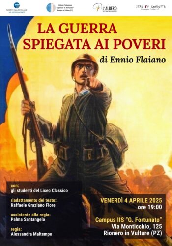 RIONERO IN VULTURE (PZ) – In occasione dell’XI edizione della Notte Nazionale del Liceo Classico, venerdì 4 aprile 2025 alle ore 19.00, presso il Campus dell’IIS “G. Fortunato” di Rionero in Vulture, andrà in scena lo spettacolo “La guerra spiegata ai poveri”, tratto dal testo di Ennio Flaiano con riadattamento di Raffaele Graziano Flore, per la regia di Alessandra Maltempo e l’assistenza alla regia di Palma Santangelo.
