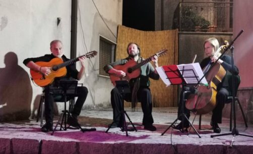 Domenica 13 luglio, alle 21: 30 è andato in scena, a San Severino Lucano,(Pz) il secondo appuntamento della Pollino Classica. In una location diversa dal primo evento, tenutosi in Chiesa Madre. Si è preferito svolgere l’evento all’aperto, per coinvolgere più gente possibile, nel magnifico scenario del largo di fronte la piazza principale. tra edifici storici che rappresentano luoghi accoglienti del piccolo borgo. Ancora una volta, la scelta è stata apprezzata dal pubblico presente nella piazzetta, lungo il corso principale ed in piazza Marconi. A fare gli onori di casa, il Maestro Giuseppe Germano, organizzatore del Festival, che per Domenica sera, ha scelto 3 artisti, nonché docenti del Conservatorio “D. Cimarosa” di Avellino: Giovanna D’amato al violoncello, Oscar Bellomo e Gianvito Pulzone alle chitarre. Non sono mancati i ringraziamenti all’Amministrazione Comunale, ed in particolare, al Sindaco il Dott. Giuseppe Ciminelli presente sul palco a ricordare che ci saranno altri appuntamenti simili in Agosto, perché la cultura non va mai in ferie. Grande merito è stato riconosciuto anche alla Pro Loco del Pollino ed a tutti coloro che hanno lavorato per la realizzazione dello spettacolo.
