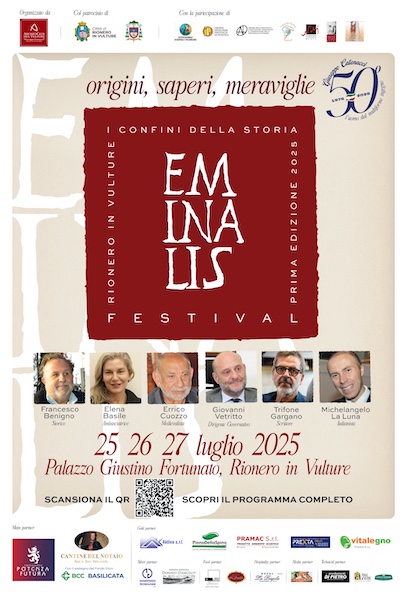 “Eminalis” è un progetto di comunità, un invito al confronto, una piattaforma per far dialogare saperi diversi. È storia viva, non monumento. È parola, non retorica. È un’occasione per tornare a pensare il Mezzogiorno non come periferia, ma come centro critico e creativo. Il festival è promosso dall’ArcheoClub del Vulture con il patrocinio del Comune di Rionero in Vulture, in collaborazione con numerose realtà culturali, professionali e accademiche, insieme al prezioso sostegno di partner istituzionali e privati.