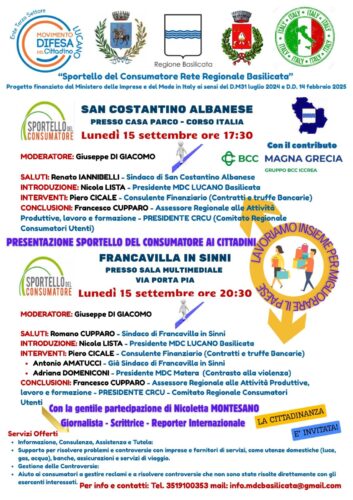 BASILICATA – L’associazione MDC Basilicata (Movimento Difesa del Cittadino) inaugura due nuovi Sportelli del Consumatore, offrendo ai cittadini un servizio essenziale di tutela e assistenza. I due eventi si svolgeranno lunedì 15 settembre in due sedi distinte, a San Costantino Albanese e a Francavilla in Sinni.