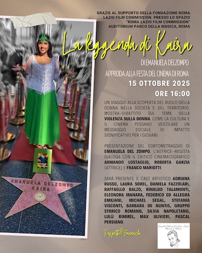Il 15 ottobre si apre la Festa del Cinema di Roma, alle ore 16.00 sarà presentato il film di Emanuela Del Zompo “La leggenda di Kaira” grazie al supporto della Fondazione Roma Lazio film Commission presso il proprio Spazio nell’ Auditorium Parco della Musica, su proposta del CineClub “De Sica” Cinit.
