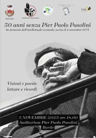 Da questa confessione di Pier Paolo Pasolini scaturisce il ricordo del Poeta regista a 50 anni dal suo assassinio, che i CineClub Cinit “Pasolini” e “De Sica” l’Associazione Torymus e il Comune di Barile hanno inteso dedicare con una iniziativa mercoledì 5 novembre ore 18, presso l’auditorium di Barile intitolato al regista. Al saluto del sindaco, Antonio Murano, seguiranno letture di brani, immagini, servizi TV, cui aderiscono studenti e studiosi. Un pomeriggio all’insegna della sobrietà, come nello stile del poeta, che anche a Barile, nel 1964, girò uno dei suoi capolavori, Il Vangelo secondo Matteo.