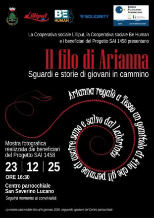 Il 23 Dicembre, nel pomeriggio, presso il Centro Parrocchiale, di S. Severino Lucano, è stata inaugurata la mostra fotografica dal titolo: “ Il filo di Arianna, sguardi e storie di giovani in cammino”. Hanno lavorato a questa opera, la Cooperativa Sociale Lilliput, che gestisce il Centro del progetto SAI 1458 del piccolo comune e la Cooperativa sociale Be Human.