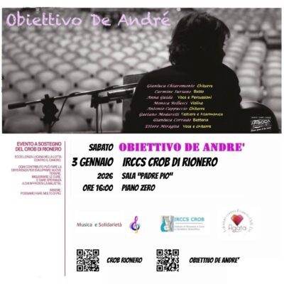 29/12/2025 – Per l’Irccs Centro di Riferimento Oncologico della Basilicata, l’anno nuovo si aprirà all’insegna della musica e della solidarietà. Sabato 3 gennaio alle ore 16 nella sala Padre Pio al piano terra dell’Istituto si esibirà la band Obiettivo De Andrè. Un evento di raccolta fondi a sostegno della ricerca scientifica contro il cancro a cui tutti sono invitati a partecipare. L’incontro nasce dall’esperienza personale vissuta dal frontman della band Ettore Miraglia ed è organizzato in collaborazione con l’associazione Agata Volontari contro il cancro, da sempre a sostegno dell’Irccs Crob. La sala al piano terra si trasformerà in un palcoscenico per lasciare spazio alla poesia e alla musica di Fabrizio De Andrè. L’intento della band, infatti, è quello di raccontare la storia di uno dei più importanti e innovativi cantautori italiani ripercorrendo il suo vasto repertorio musicale e poetico. Oltre a Ettore Miraglia si esibiranno Gianluca Chiaromonte alla chitarra, Carmine Suriano al basso, Anna Guida voce e percussioni, Monica Bellusci al violino, Antonio cappuccio alle chitarre, Gaetano Modarelli alle tastiere e fisarmonica e Gianluca Corrado alla batteria.